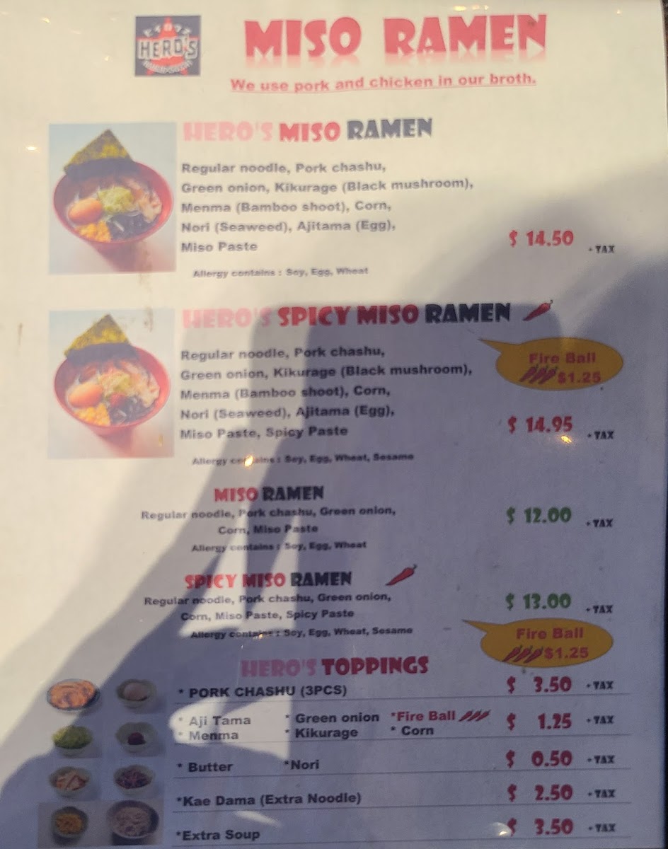 Hero's Miso Ramen is the miso & pork-based ramen. The broth is our original and it comes with an ajitama,(Marinated egg), kikurage(black mashrooms), memma(bamboo shoots), cut green onions, chashu (pork) and corn for toppings.